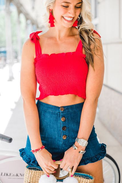 Want to take it further? Add a vintage scarf, claw clip, or some Fourth of July centerpieces you can repurpose in your outfit. That’s what we call modern Fourth of July party themes, the outfit edition.