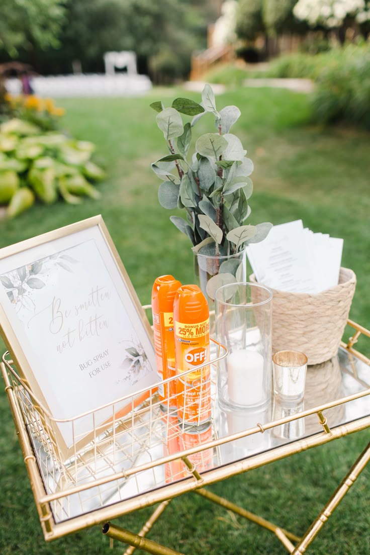 - Have cute baskets of insect repellent wipes or mini sprays available for guests. bonus if they’re in pretty bottles that match your décor.