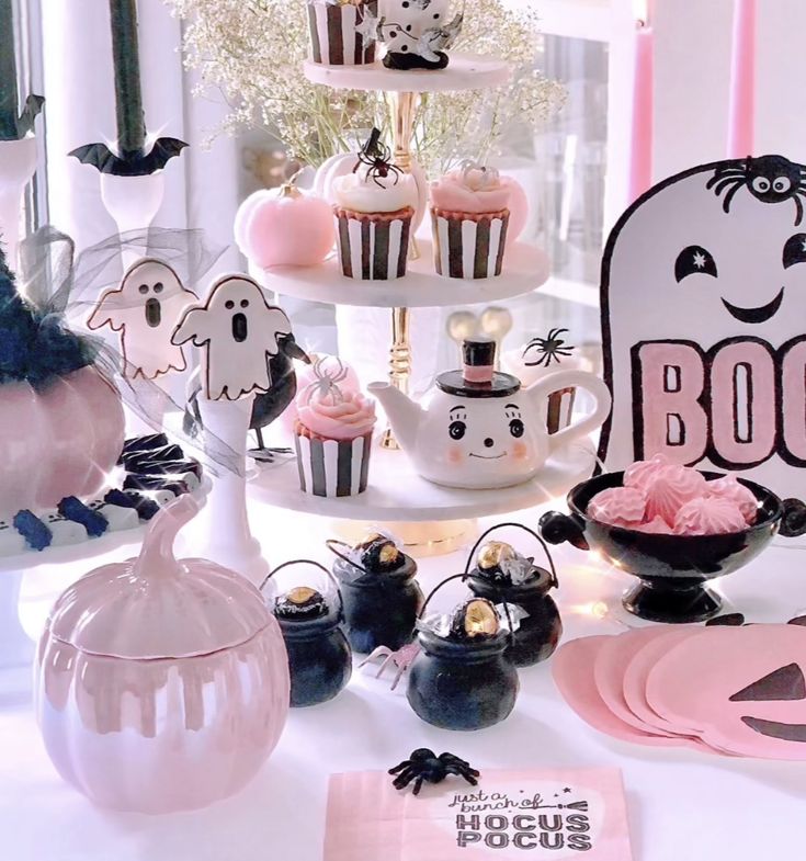 Soft, spooky, and totally unexpected. This theme merges cotton-candy pink, lilac, and muted black for a look that’s equal parts eerie and adorable. Think bat-shaped sugar cookies, pink skull cake pops, and velvet bows tied around taper candles.