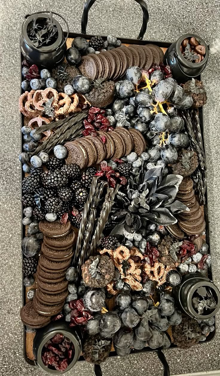 For a Halloween themed food setting that leans more curated than chaotic, think of your board as a still life: rich, seasonal colors arranged in balance. Charcoal crackers beside folded deli meats. Blackberries nestled near wedges of brie. Dried orange slices catching soft light.