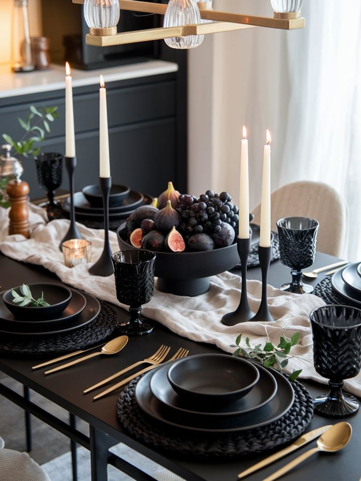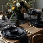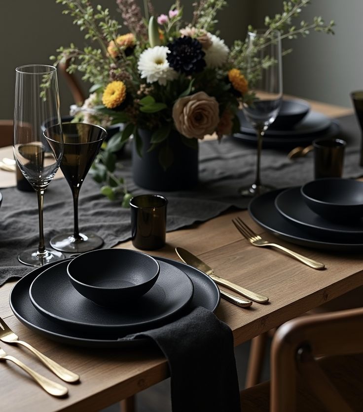 - Choose moody neutrals: black ceramic, smoked glass, matte slate, and aged wood create a rich base that lets the food shine.