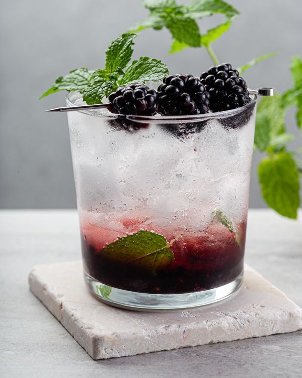 - Blackberry thyme gin fizz – moody in tone, aromatic, and not too sweet. Serve with a sprig of thyme or a single blackberry on a cocktail pick.
