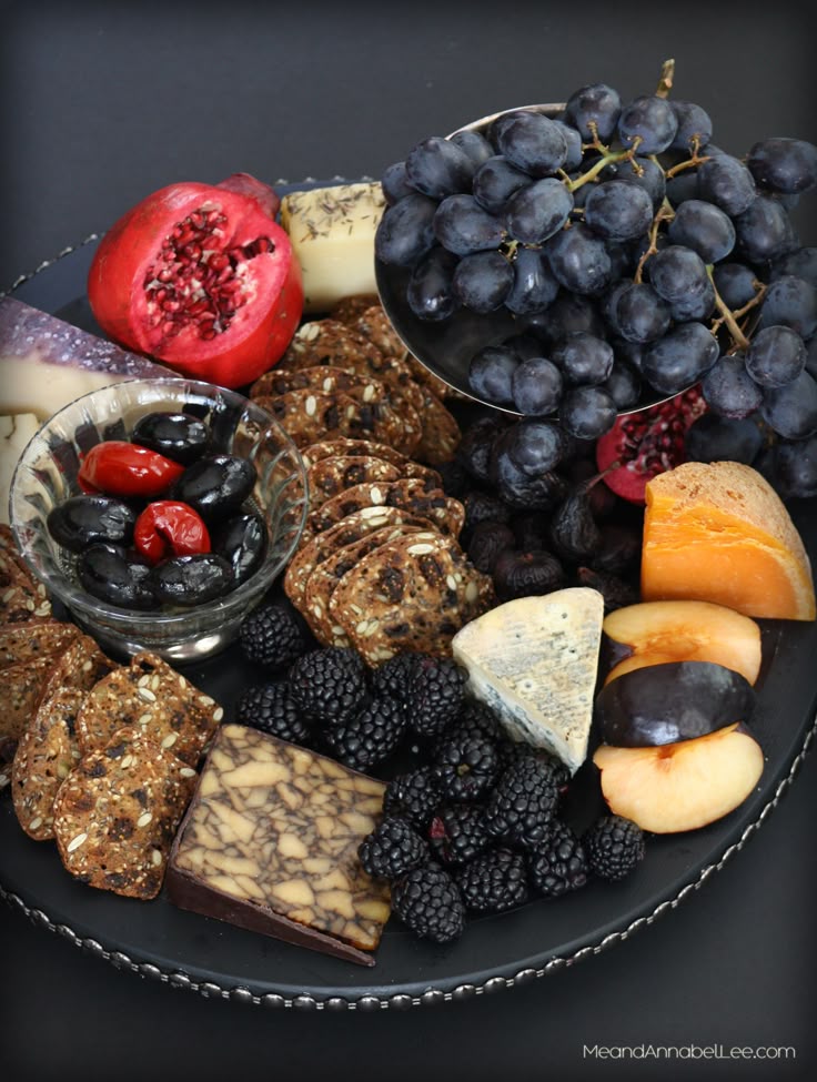 - A mix of bold and muted: Think figs, black grapes, and plums for depth. Add white cheeses like brie or manchego to soften the mood.