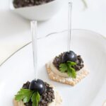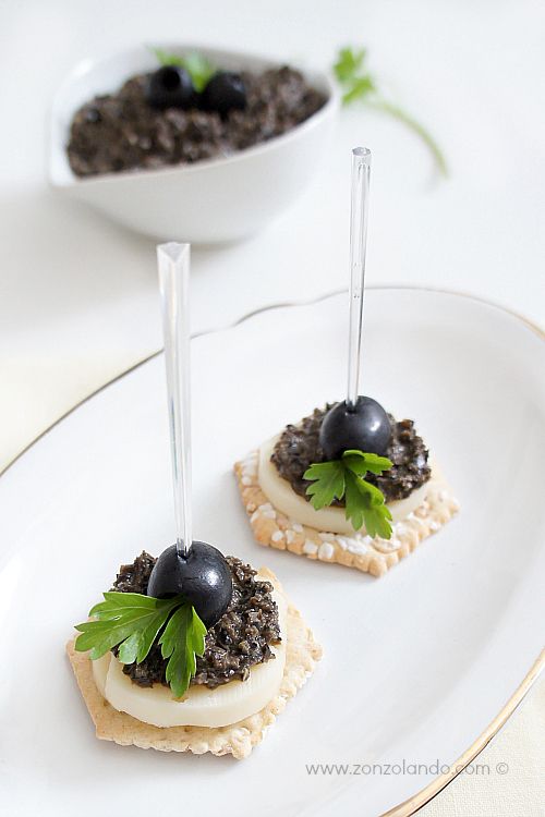 - Crostini con pesto di olive nere – crisp, toasted slices of baguette layered with a smooth black olive tapenade. Rich, briny, and understated, these little bites bring deep flavor and a moody palette that feels right at home on a Halloween table without needing a costume.